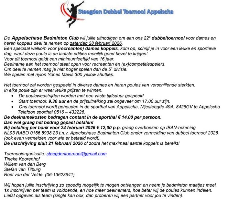 Op deze pagina vindt je een overzicht van de toernooien welke bij onze vereniging zijn aangemeld.